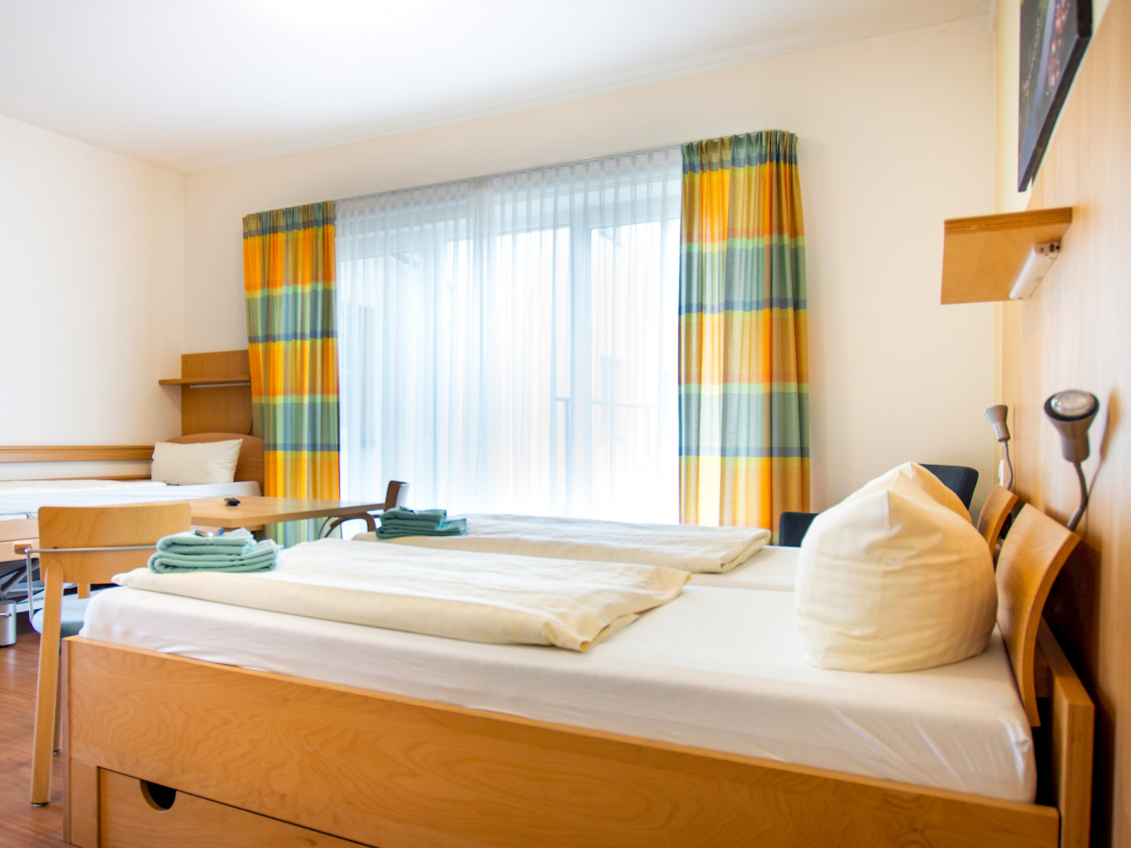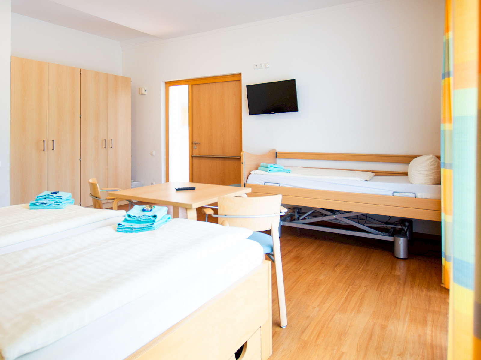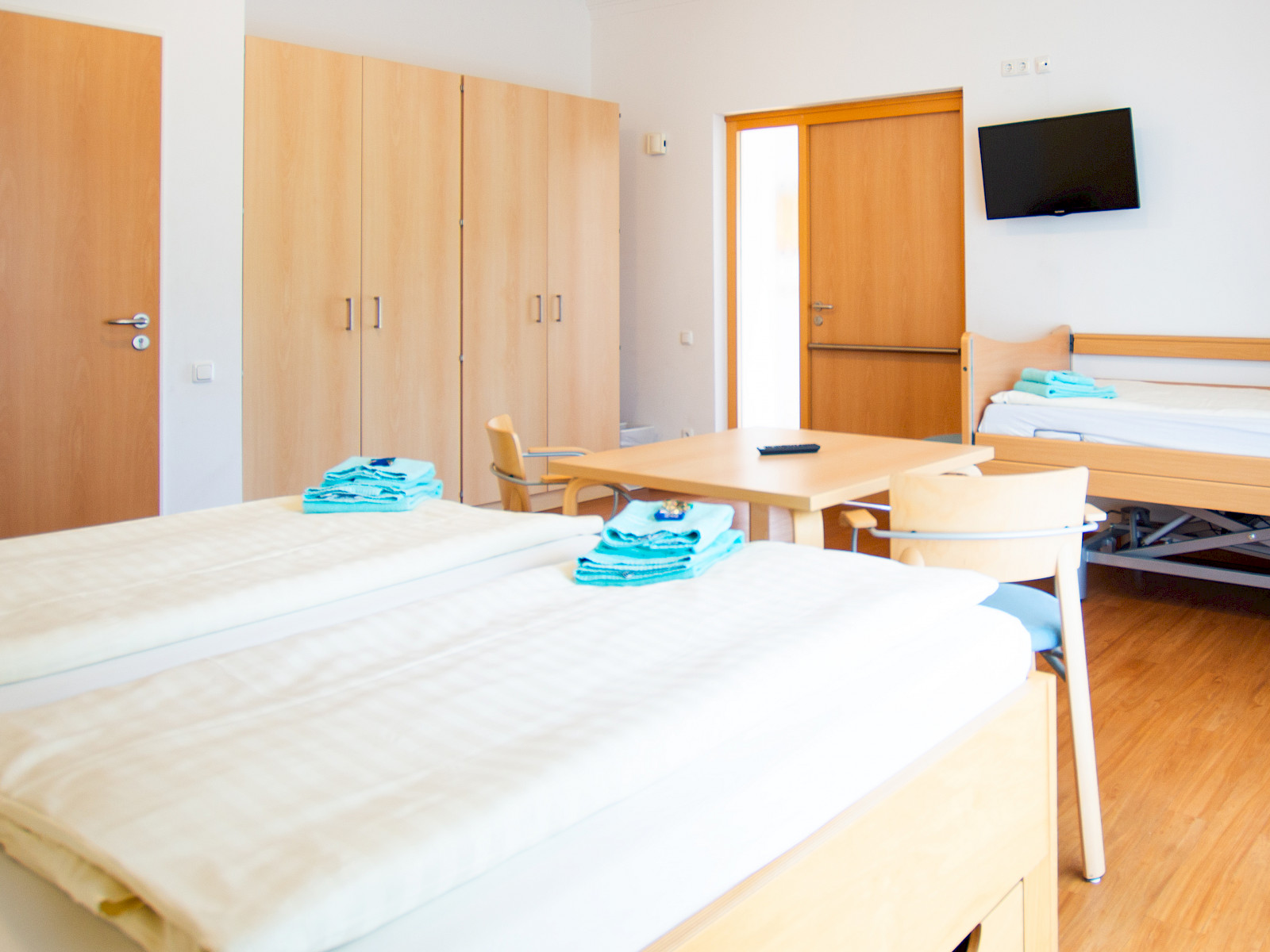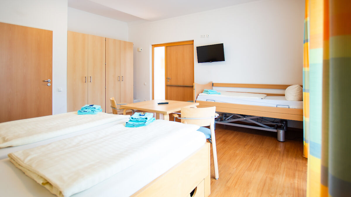 - 2 Dreibettzimmer mit jeweils einem Pflegebett und Kühlschrank
