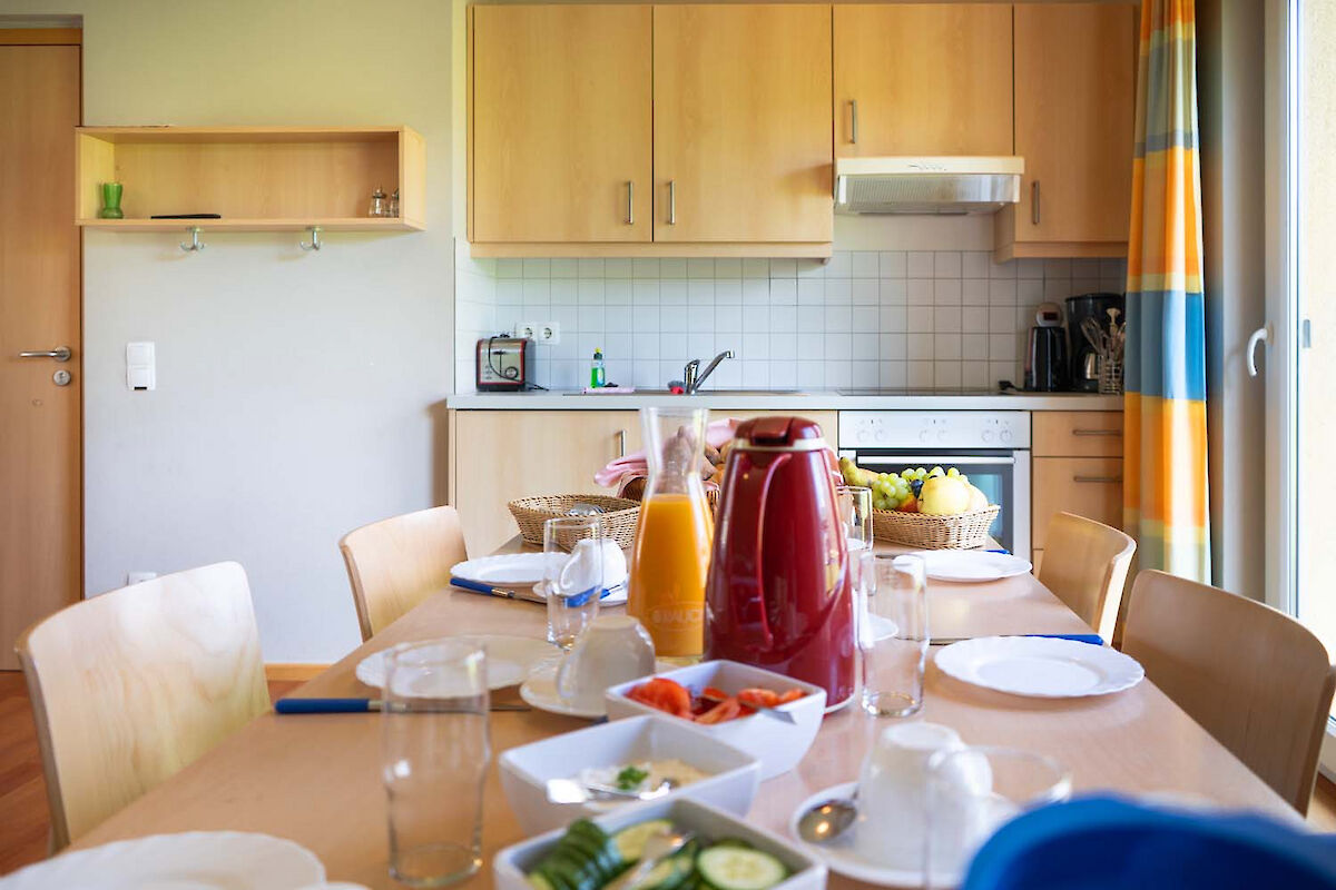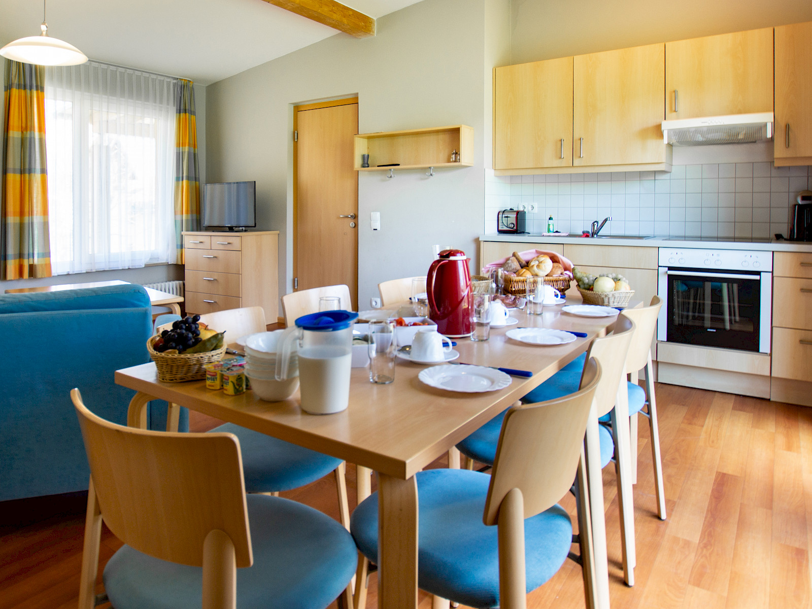 - Wohnküche mit großem Esstisch und Zugang zur Terrasse